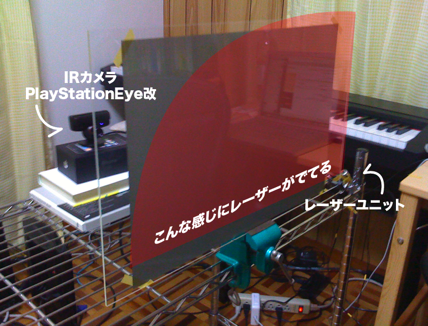 原理的には、アクリルのスクリーンの表面すれすれに、放射状に広がるレーザーを飛ばして、指がレーザーにあたると光るのでそれをIRカメラで撮影するという感じです。うん、わかりにくい説明だね。