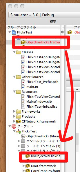 5.一旦情報を見るWindowを閉じて、ObjectiveFlickr.xcodeprojからlibObjectiveFlickr.a をターゲットの「バイナリをライブラリに追加」へDrag&Drop