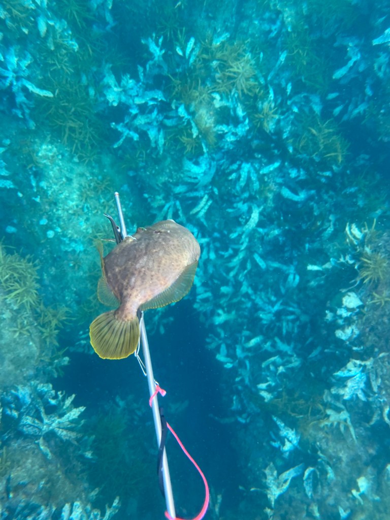カワハギは動作速度が結構鈍目でなかなか無防備な魚ですね。もうちょっと良いところに当てたいですが、当てるだけで精一杯です。