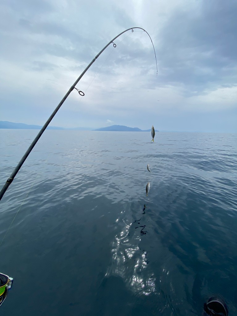 他にもちょっと沖で、ジグサビキで豆ではないけどフルサイズでもない、ちいこめのアジを釣りました。