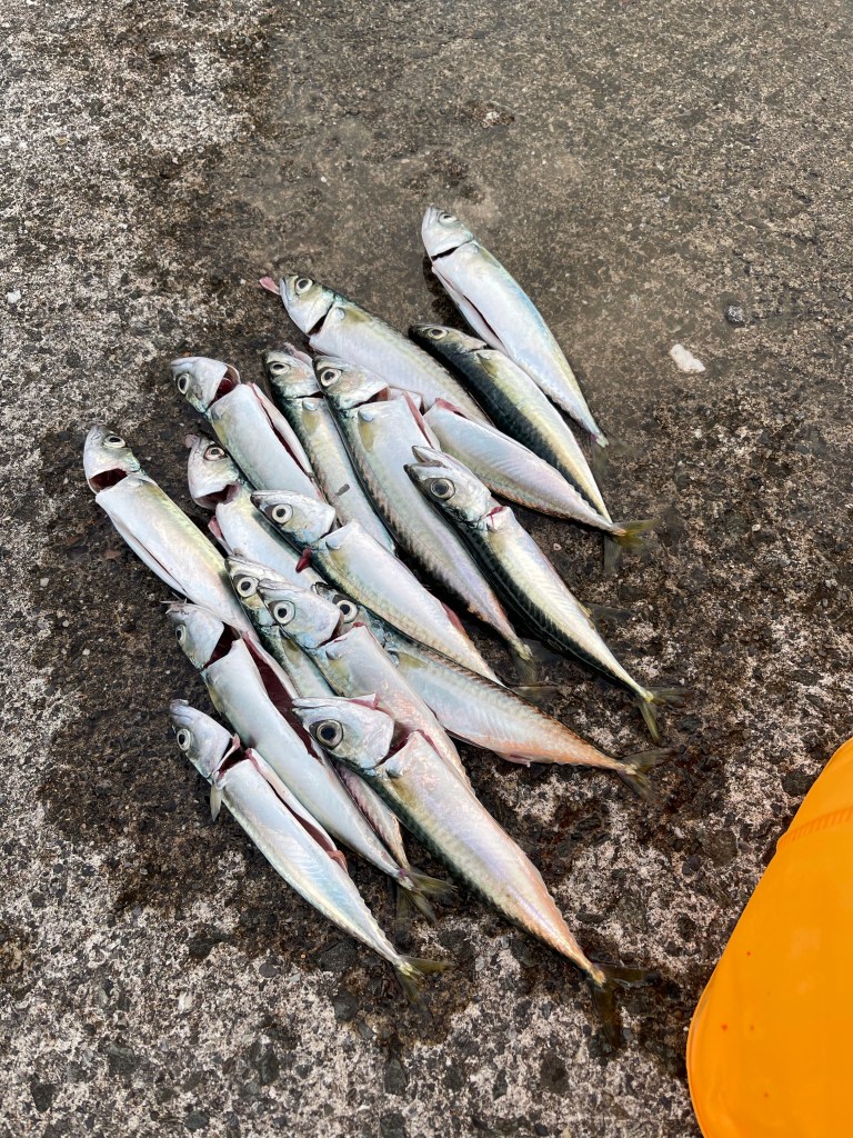 いたのは鯖でした。サビキで釣ってみます。鯖は初めて釣りますがものすごい勢いで泳ぐので、1匹つくとカゴの中の餌が揺れてぜんぶでちゃいます。