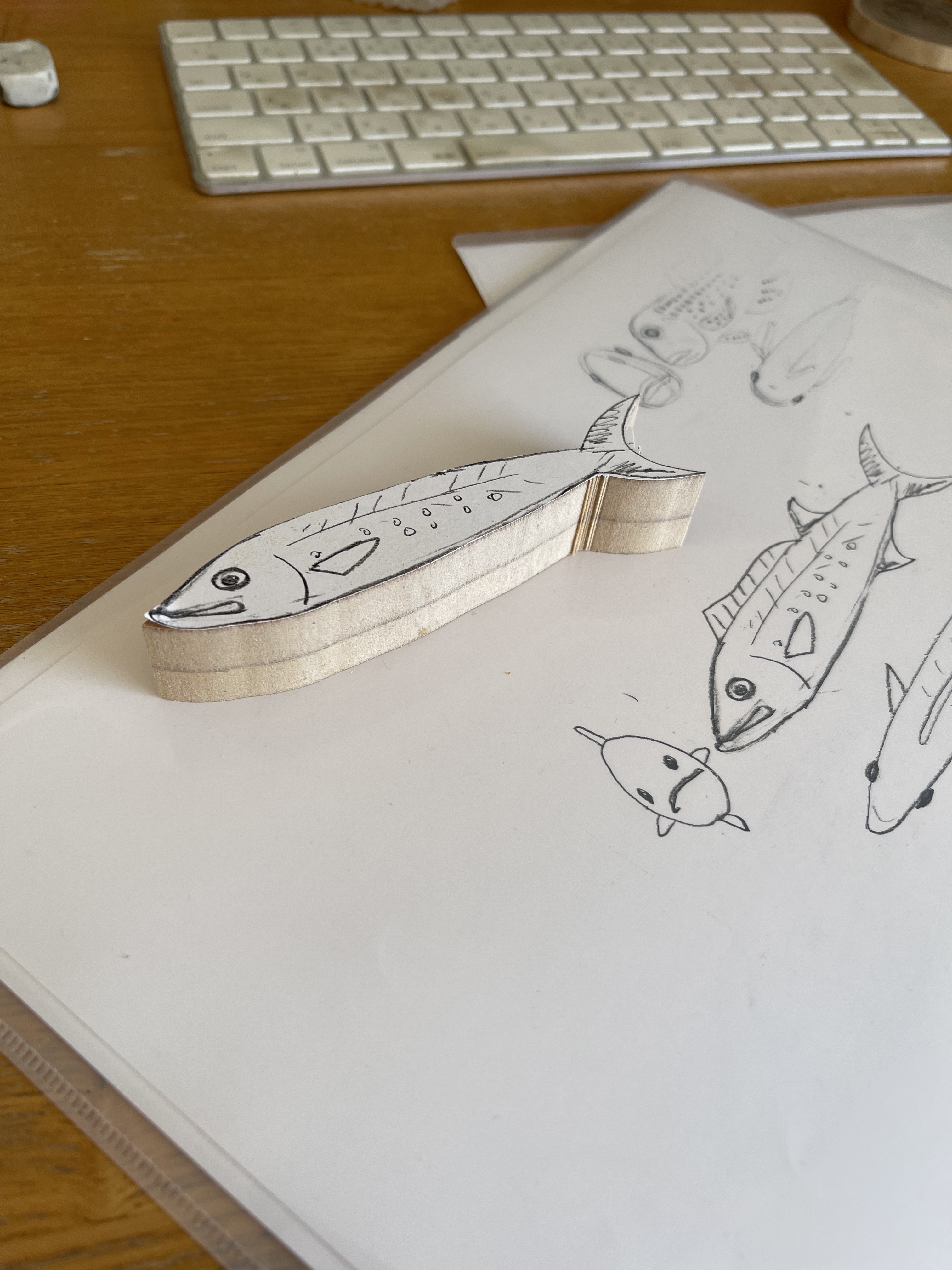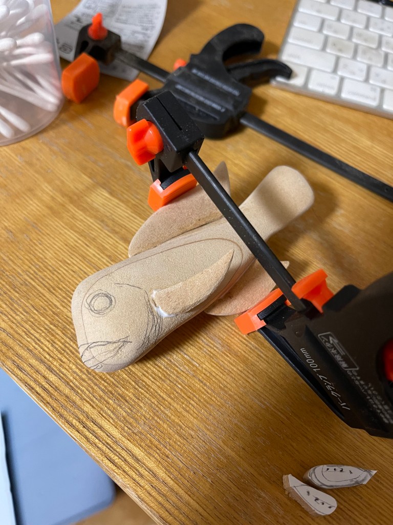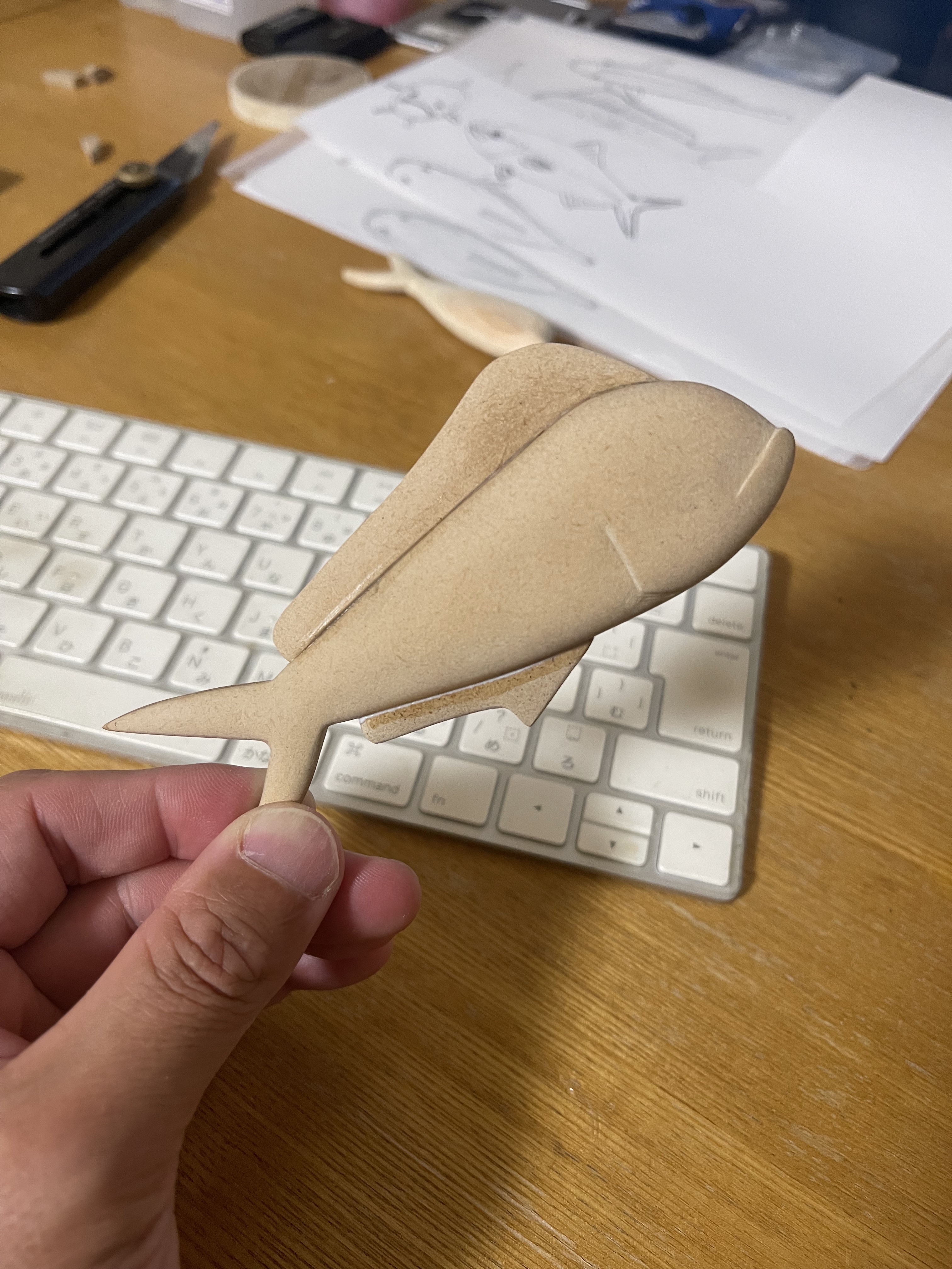 ヒレも薄めのMDFをコッピングソーで切ります。ひとまず外形だけ切って、なんとかします。