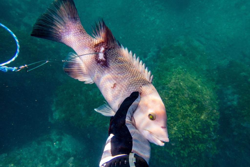 お魚、結構いて、何匹か捕まえました。これはコブダイの幼魚のようです。頭を狙ったのだけど、逃げられて、胴体に刺さっちゃいました。