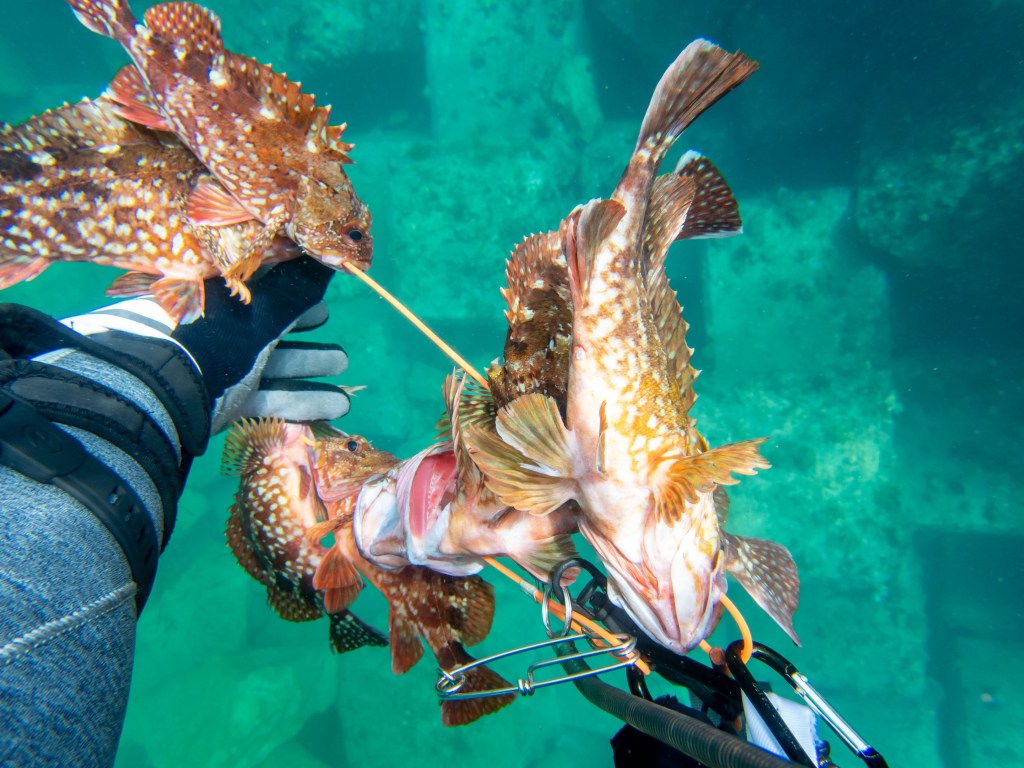 水温は30度程度、ウェットは1.5mm ウェイトは3kgです。3kgではちょっと浮きますが、7mほど潜ると沈み始める感じです。