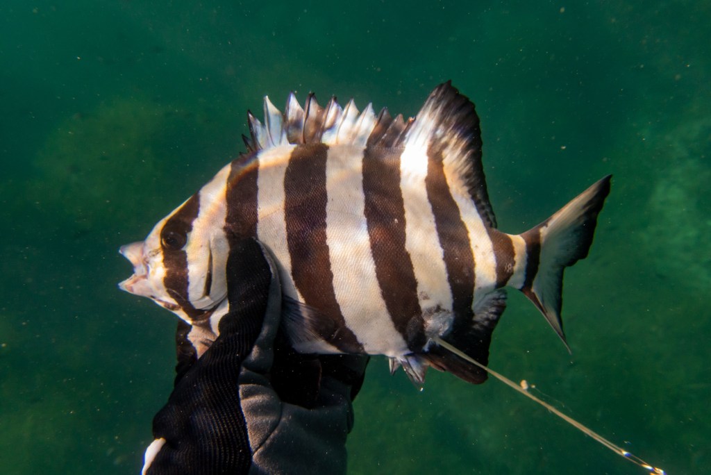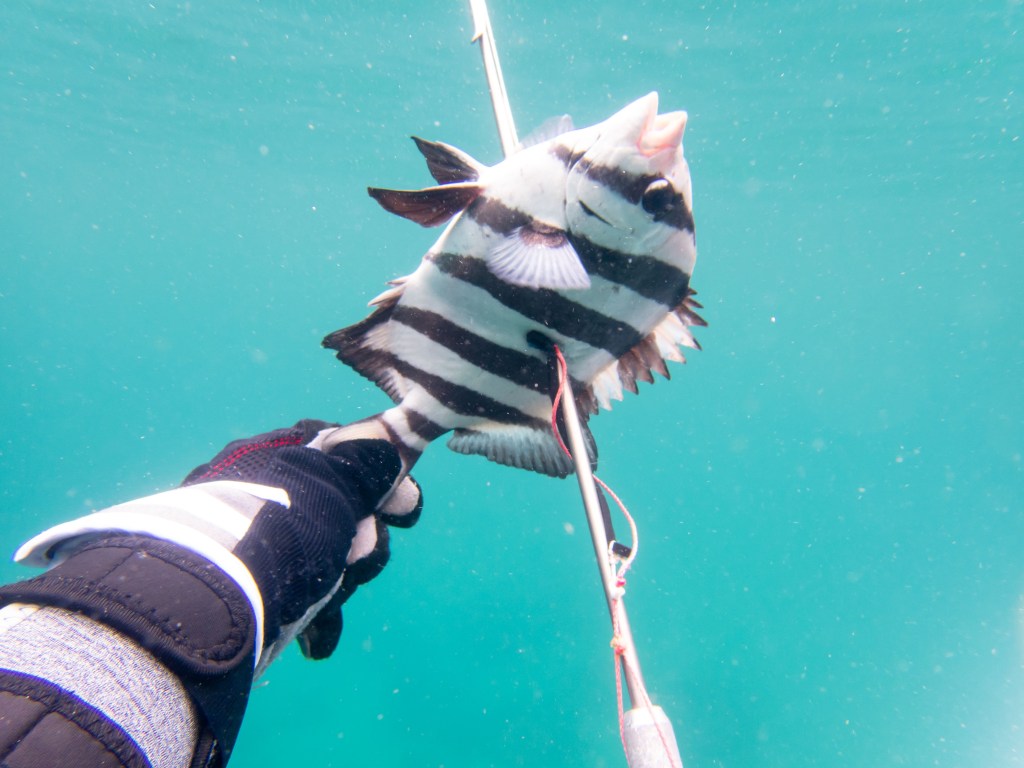 サンゴ礁までたどり着いたあたりでホシフエダイらしき魚影を発見してモリを打ち込みます。あたったのですが、そのあと暴れて逃げられちゃいました・・・