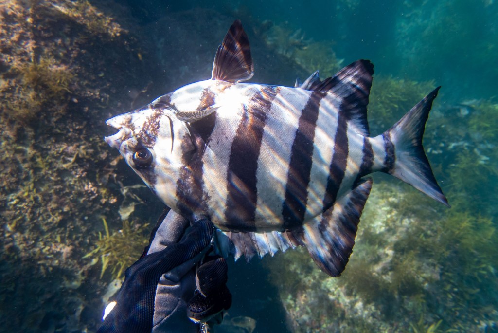 次々いきましょう。潜るとたくさんのイスズミがいます。その間にボーとした魚がいます。チョウチョウコショウダイです。50cmくらいあります。