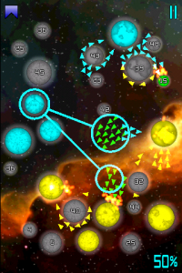 Galconは基本的にはリアルタイムストラテジーの仲間で、星を乗っ取って兵隊をたくさん作るっていうシンプルなゲームなんだけど、タッチパネルとの相性の良さで異常に面白いゲームになっている。かなり中毒性が高いゲームですわ。価格は1200円と結構いい値段するんだけど、この面白さなら納得できるかもしれません。